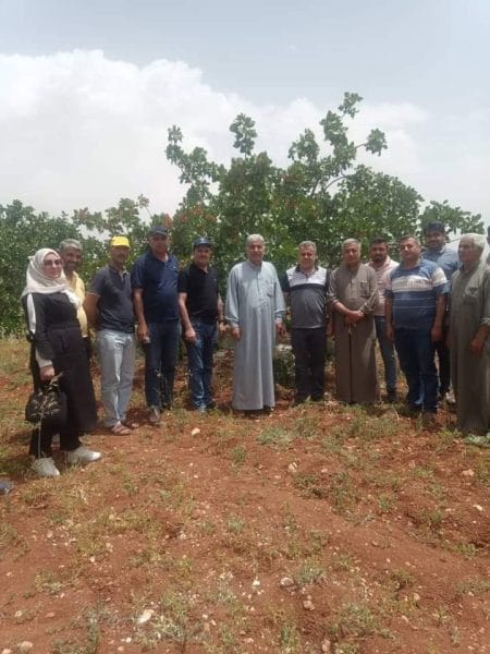 كما تم إجراء بيانات عملية حول تطعيم شجرة الفستق الحلبي بطريقة العين اليقظة، والإجابة على تساؤلات المزارعين وتقديم الإرشادات المناسبة.