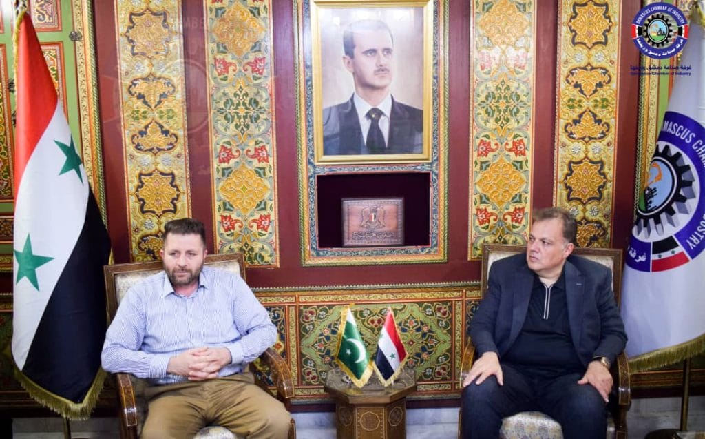 بحث رئيس غرفة صناعة دمشق وريفها الأستاذ غزوان المصري مع القائم بأعمال سفارة جمهورية باكستان الإسلامية في دمشق السيد عمر حيات خان سبل تعزيز وتطوير العلاقات الاقتصادية والتجارية الثنائية بين البلدين الصديقين، وذلك خلال اللقاء الذي عقد في مقر الغرفة.