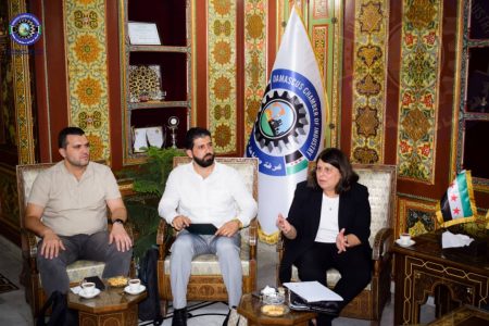 بحث رئيس غرفة صناعة دمشق وريفها المهندس محمد أيمن المولوي في مقر الغرفة مع أخصائية تنمية المشاريع في المكتب الإقليمي للدول العربية لمنظمة العمل الدولية بدرة علوة ، في مقر الغرفة استكشاف فرص التعاون بين المنظمة والغرفة لتعزيز ريادة الأعمال وتنمية القطاع الخاص في سورية.