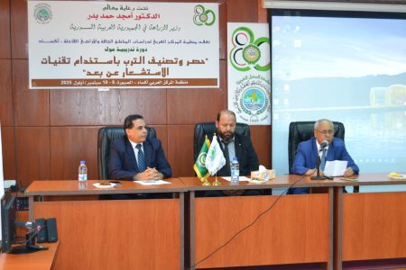 ضمن إطار الجهود المستمرة لمنظمة المركز العربي أكساد لدعم عجلة الزراعة المستدامة في الوطن العربي بشكل عام وفي الجمهورية العربية السورية بشكل خاص، وتحت رعاية معالي الدكتور أمجد بدر وزير الزراعة، افتتحت بمقر منظمة المركز العربي لدراسات المناطق الجافة والأراضي القاحلة “أكساد”، الدورة التدريبية المتخصصة بعنوان “حصر وتصنيف التربة باستخدام الاستشعار عن بعد”، وناب عن معالي الوزير، الدكتور أيهم عبد القادر معاون وزير الزراعة، بحضور أصحاب السعادة عميد كلية الهندسة الزراعية ونقيب المهندسين الزراعيين في سوريا.
