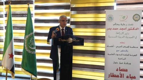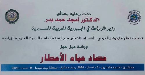 برعاية معالي الدكتور أمجد بدر، وزير الزراعة في الجمهورية العربية السورية، وبالتعاون مع الهيئة العامة للبحوث العلمية الزراعية، نظّمت منظمة المركز العربي لدراسات المناطق الجافة والأراضي القاحلة (أكساد) ورشة عمل تخصصية حول حصاد مياه الأمطار، الاربعاء 8 نيسان 2026، بمشاركة واسعة تجاوزت 100 مسؤول وخبير وممثل عن الجهات الحكومية والمنظمات الدولية المعنية بقطاعي المياه والزراعة.