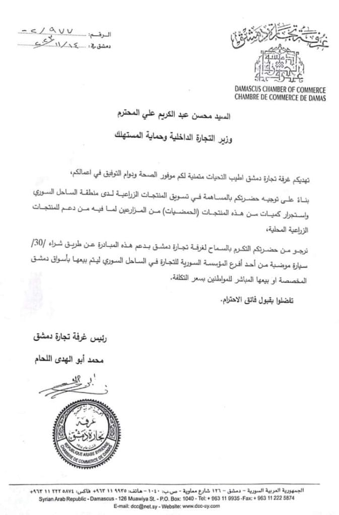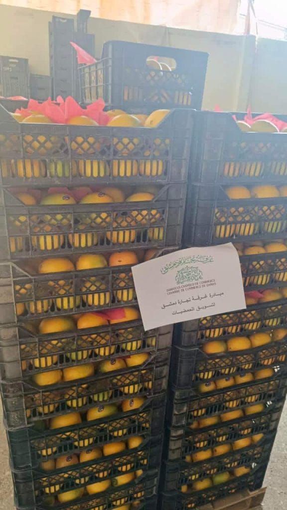 بهدف دعم المزارعين للمنتجات الزراعية وبحسب الأولوية في الوقت الحالي لبيع الحمضيات من الساحل السوري وبدورها غرفة تجارة دمشق ومن باب المسؤولية الاجتماعية قامت بالتنسيق بينها وبين السورية للتجارة بشراء كدفعة أولى /30/ سيارة من الحمضيات ليتم بيعها عبر الأسواق في دمشق والدفعة الثانية ليتم بيعها خارج سورية عبر مصدّري الخضار والفواكه وعبر علاقات السادة أعضاء غرفة تجارة دمشق مع الدول الصديقة.